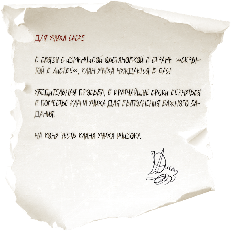 Ещё бы чуть-чуть и летящее мимо пернатая птица врезалась в его крепкую грудь, падая комочком вниз. Но вот, легендарная птица из не менее известного клана Учиха грациозно облетела нежное лицо обладателя проклятых глаз, легонько касаясь своими черными крыльями, заставляя того очнуться и придти в себя. Сделав небольшой полетный круг в округ Учиха-младшего, ворон с диким криком присел на плечо Саске, удерживая в левой лапке аккуратно свернутый бумажный носитель. Когда процедура передачи послания завершилась, ворон громко издал прощальное: "Кар", - на ушко Саске и взмыл над головой патлатого, отдаляясь все дальше и дальше.