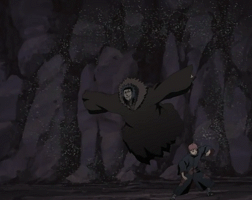 Сандайме шёл себе спокойно и держал ухо востро, но благодаря напарнице узнал о приближении врагов заранее, посему решил не испытывать судьбу и снял пробку от своей тыквы, а следующим действием управляя магнитными полями заставил железный песок выбраться из тыквы и принять форму десяти пульМорось Железного Песка